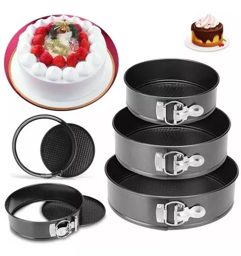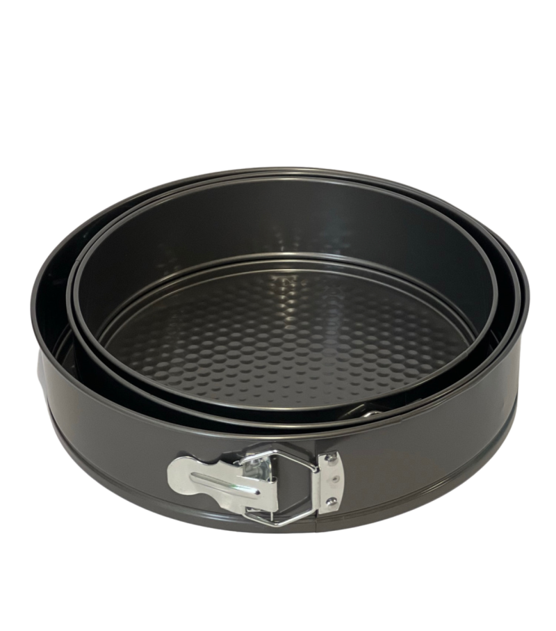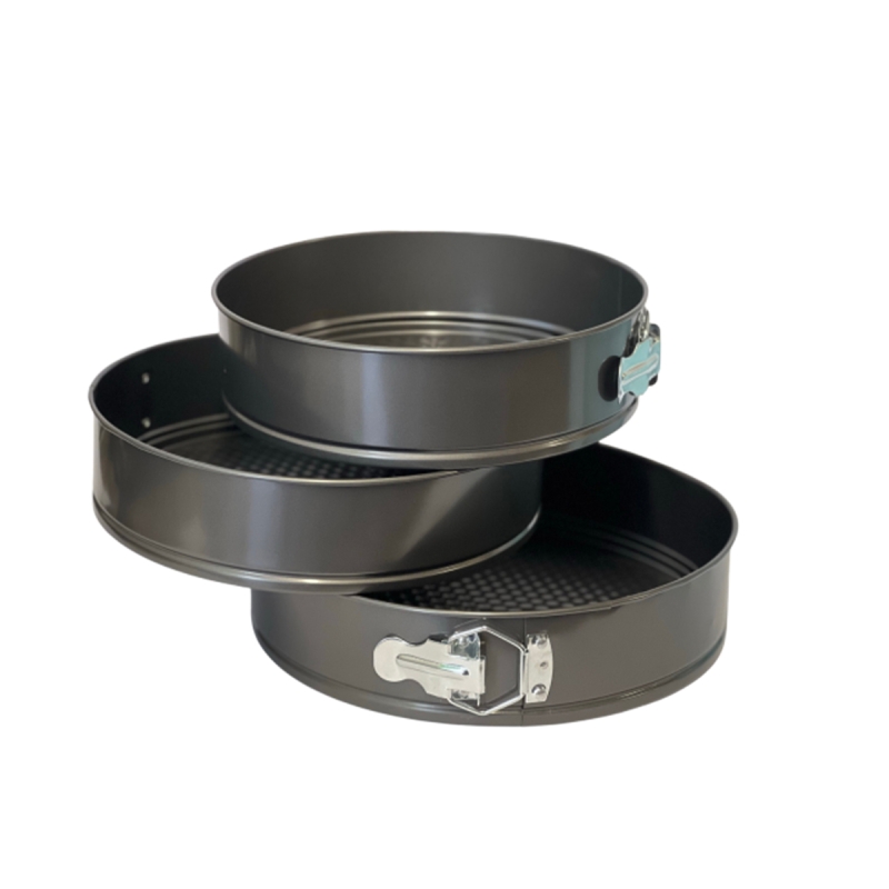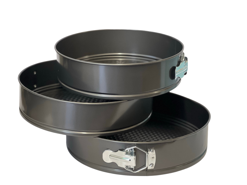 Комплекта съдържа 3 кръгли форми за печене с падащо дъно и удобна закопчалка на стените.