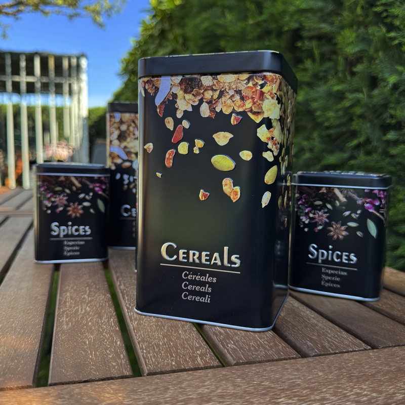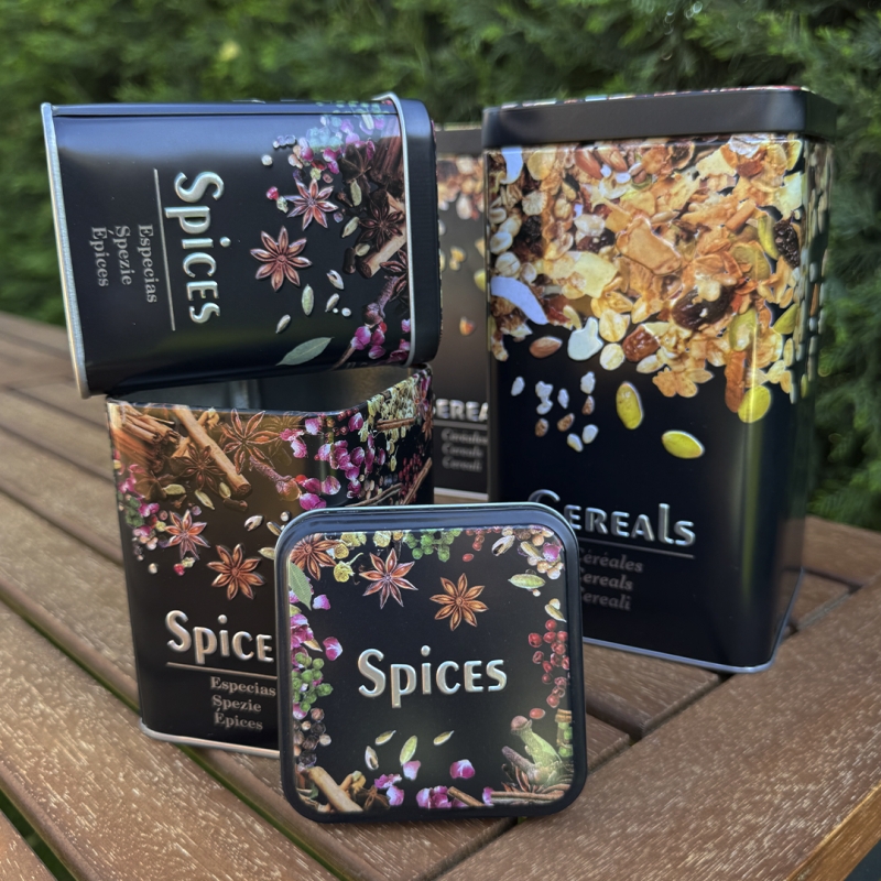 Практична метална кутия за съхранение на ядки, зърнени закуски, бонбони, подправки, и други.