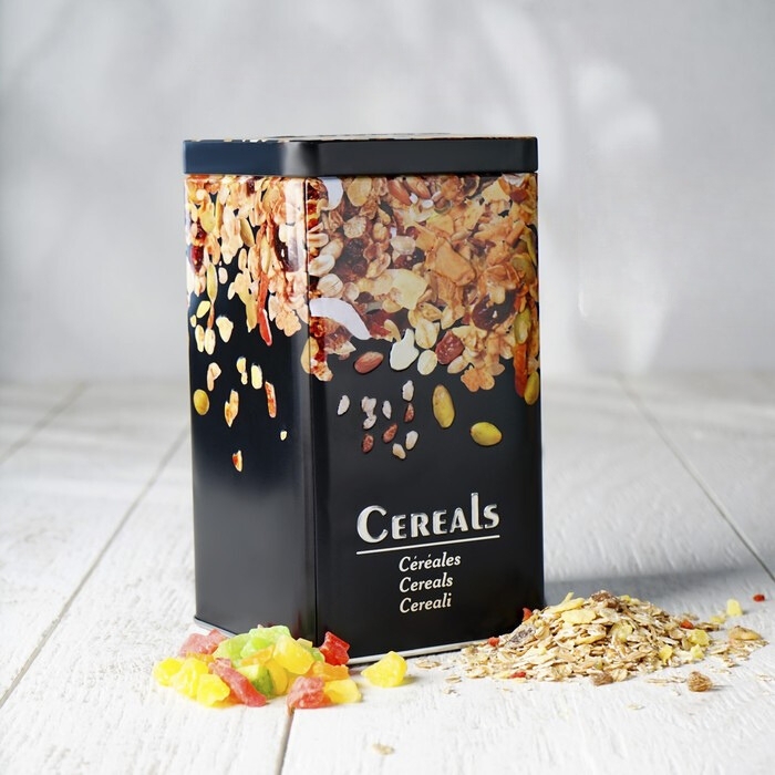 Кутията е метална и голяма и може да се използва като универсасално решение за съхранение на всякакъв вид сухи храни.