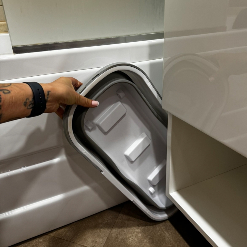 Тя е достатъчно голяма, но след като се сгъне, лесно може да се прибере между пералнята и стената.