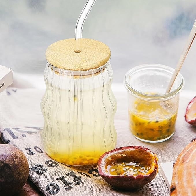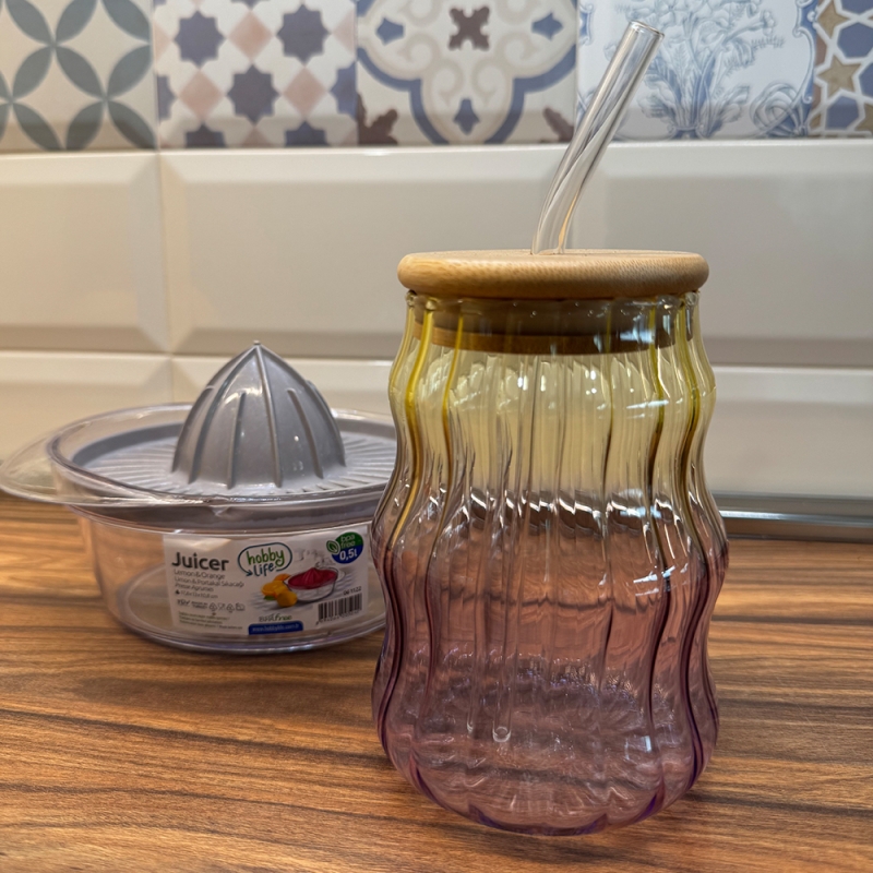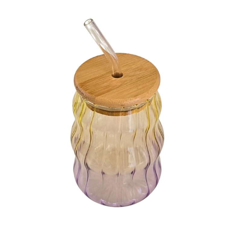 Изработен от устойчиво стъкло с подходяща дебелина, и бамбукова капачка на която има отвор за поставяне на стъклената сламка.