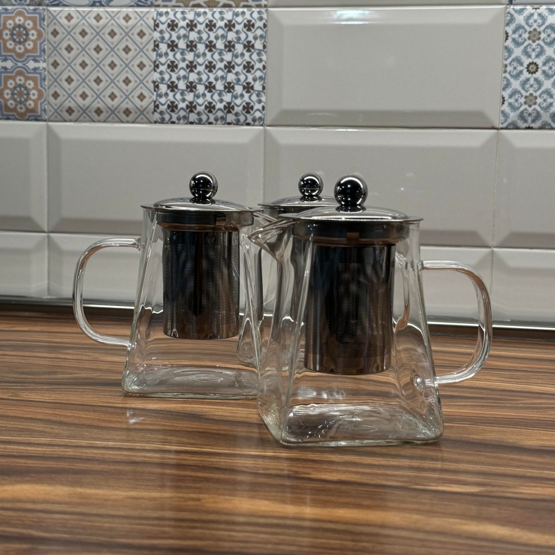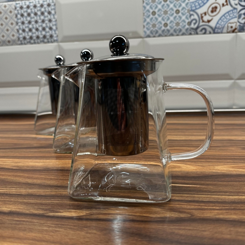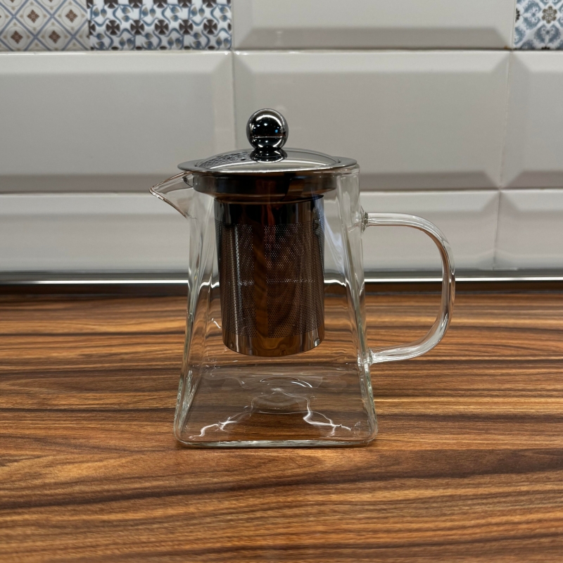 Каничка с цедка изработена от боросиликатно стъкло, а капака и цедката на каничката са изработени от метал