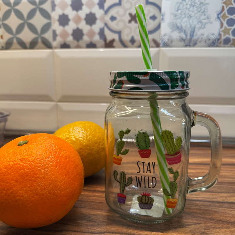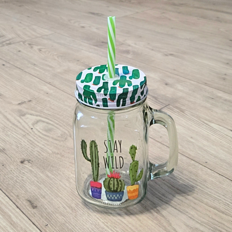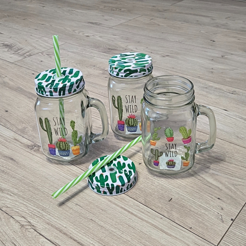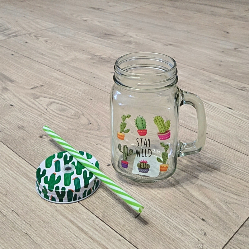 Изработен от устойчиво стъкло с подходяща дебелина, и метална капачка на която има отвор за поставяне на пластмасова сламка.