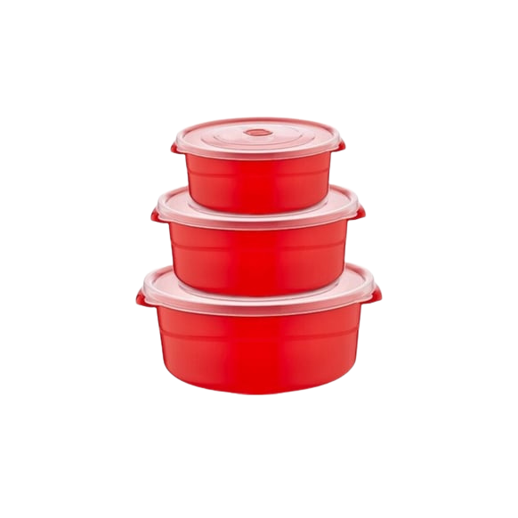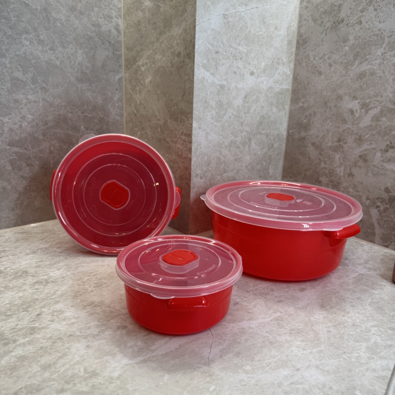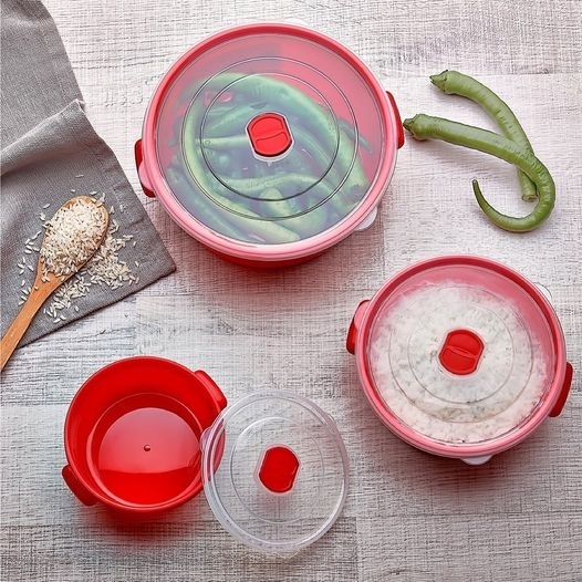 Комплект от 3 броя пластмасови кутии с плътно затварящ се капак за използване в микровълнова фурна.