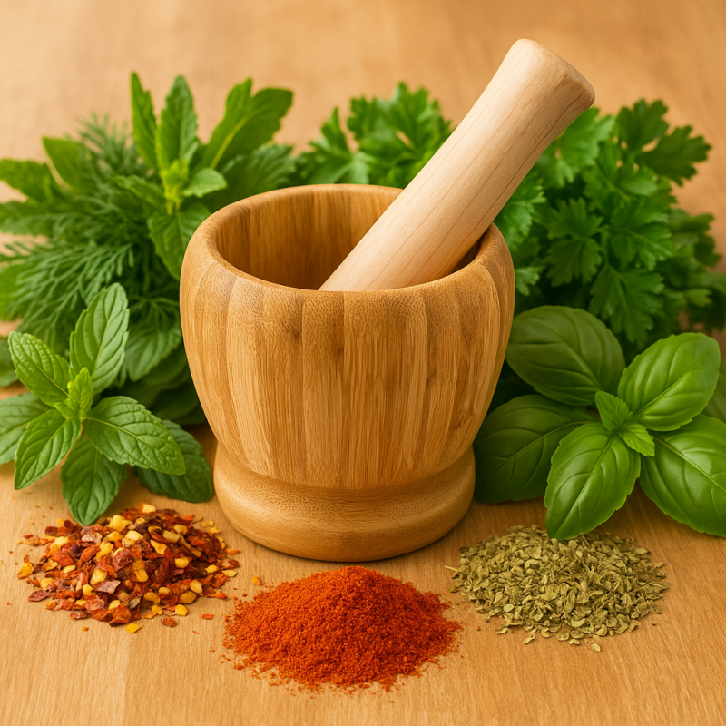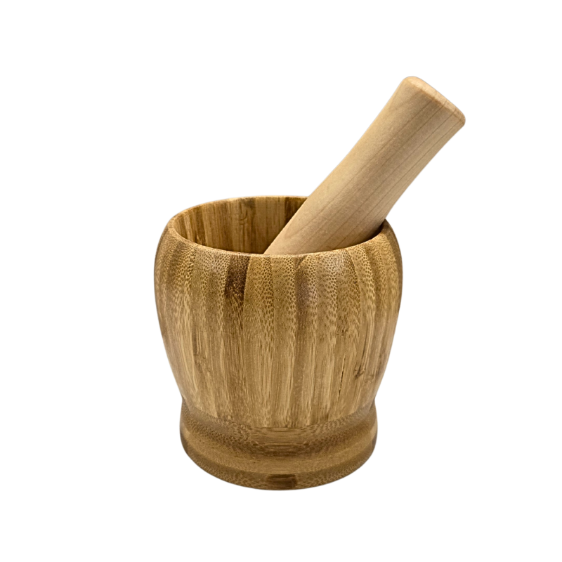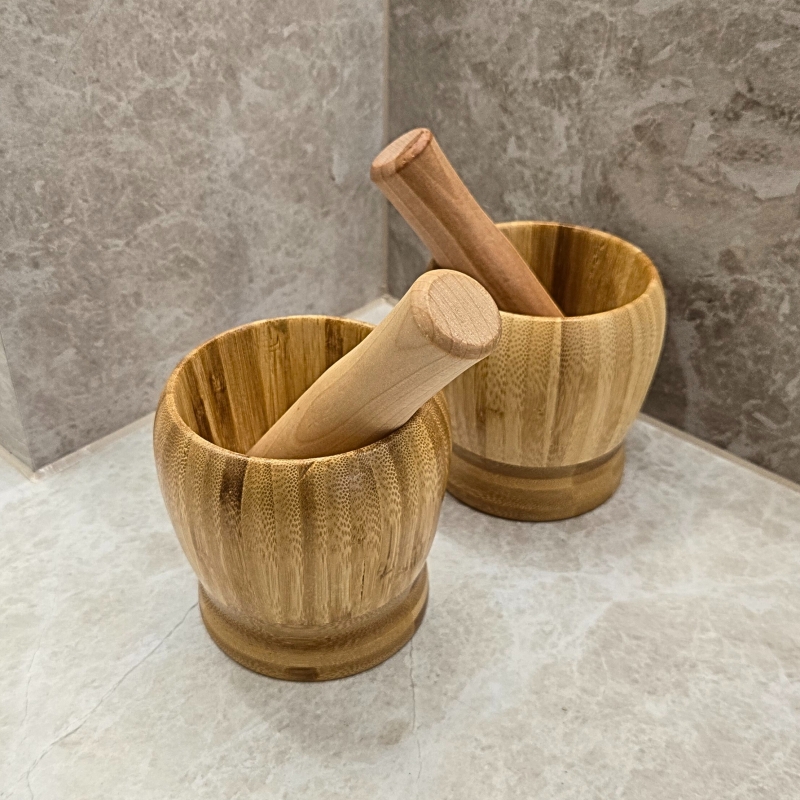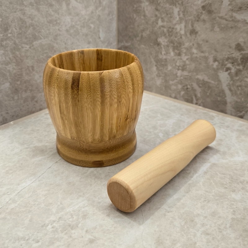 Компактно хаванче с чукало, изработени изцяло от бамбук – практично решение за стриване на подправки, ядки и билки.