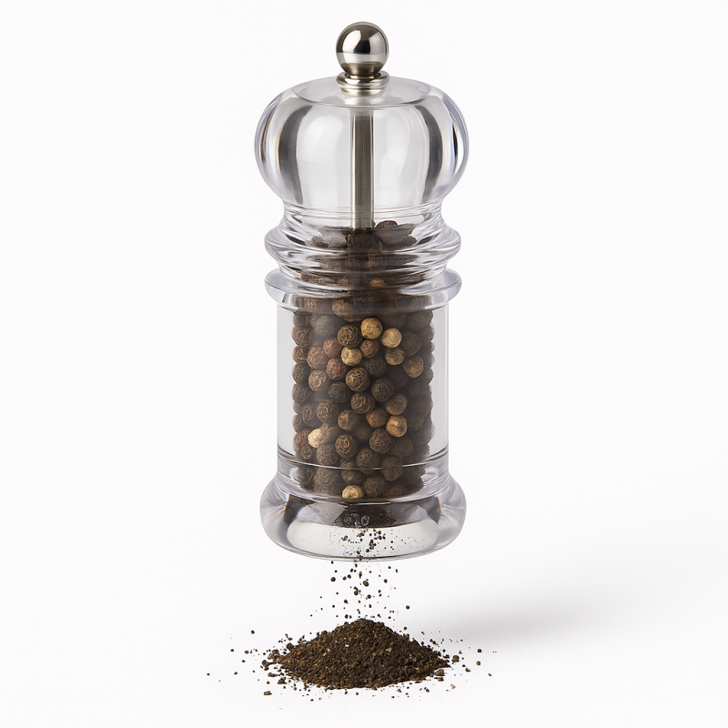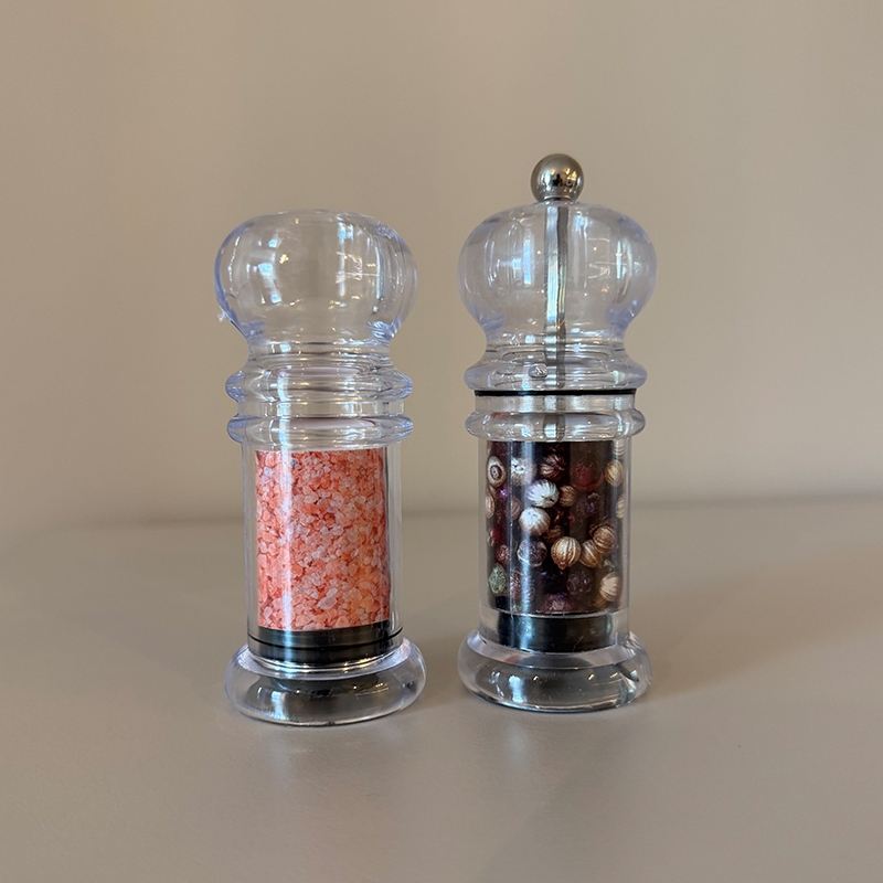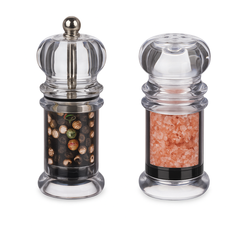 Комплект мелничка за пипер и солница, изработени от прозрачен акрил.