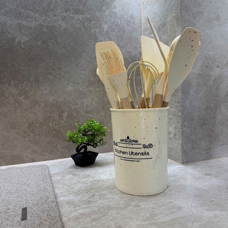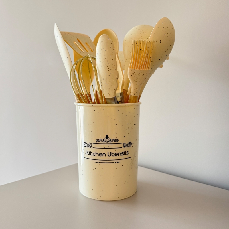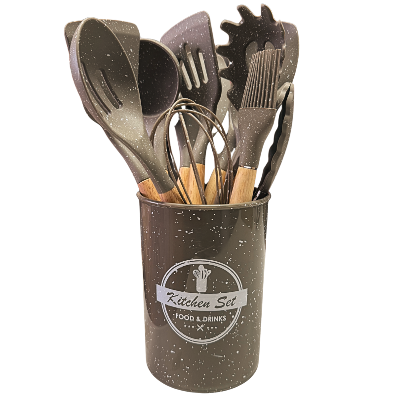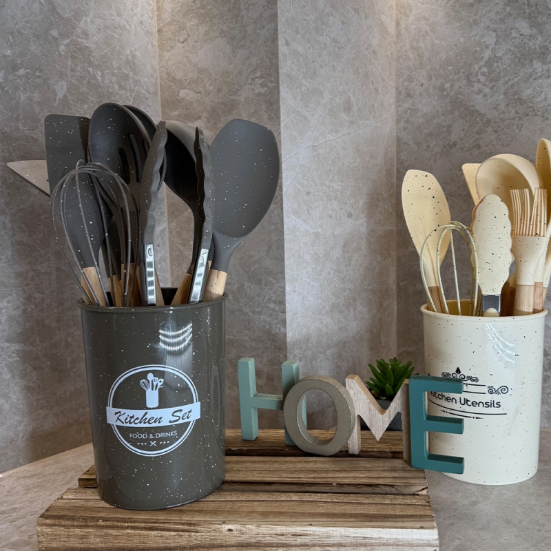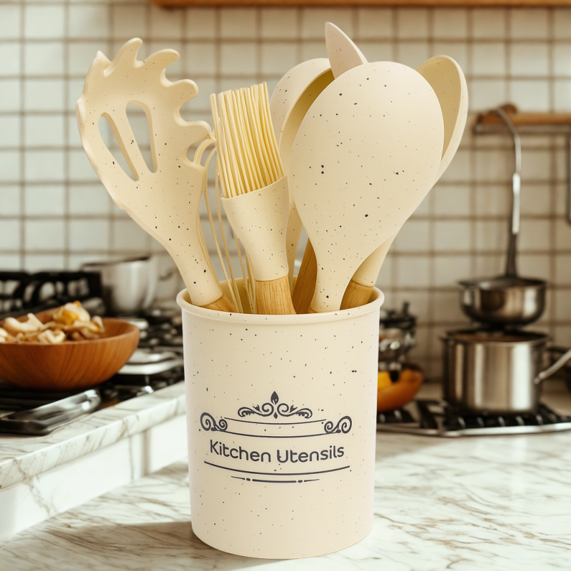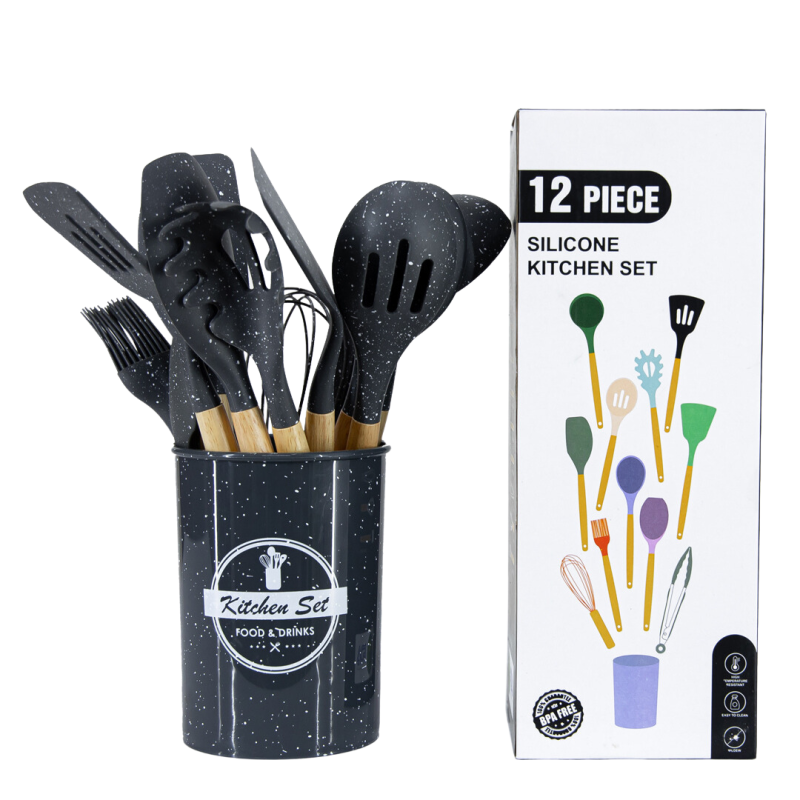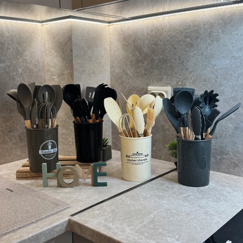 Този елегантен комплект от 12 силиконови прибора с мраморен дизайн е идеалното допълнение към всяка модерна кухня.