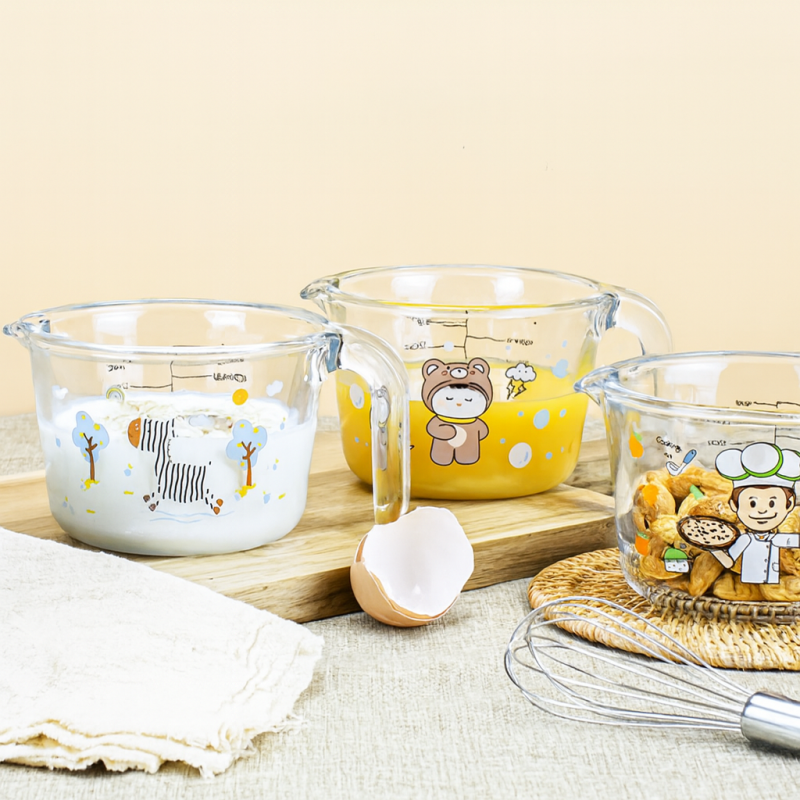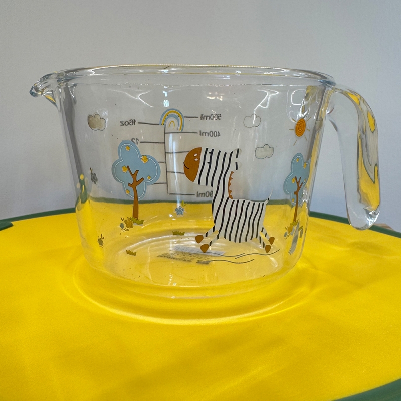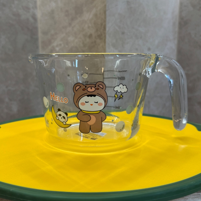 Добавете практичност и цвят в кухнята си с този стъклен мерителен съд с дръжка и забавен детски дизайн.