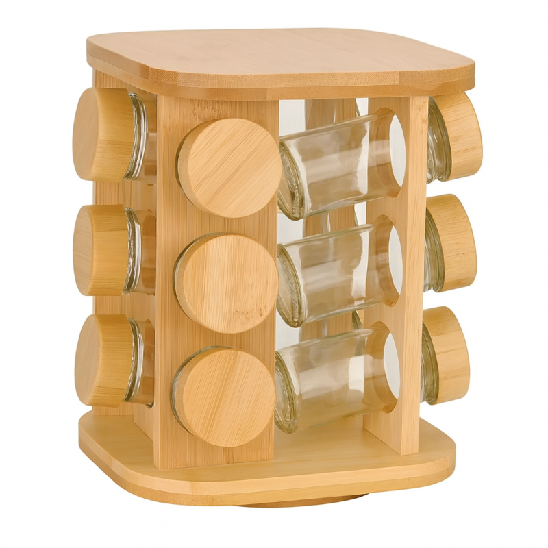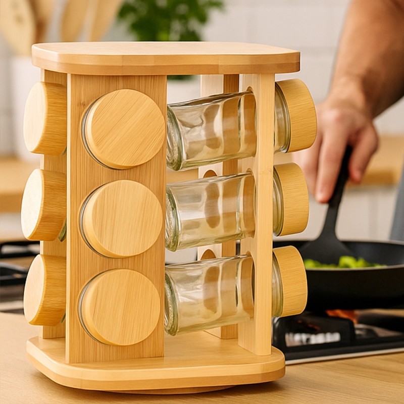 Добавете ред и елегантност в кухнята си с този стилен въртящ органайзер за подправки с 12 стъклени бурканчета.