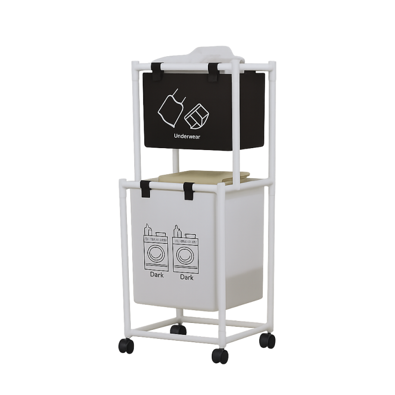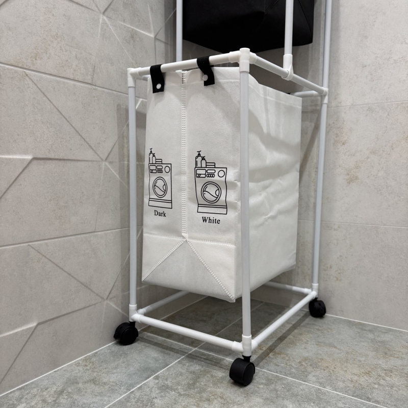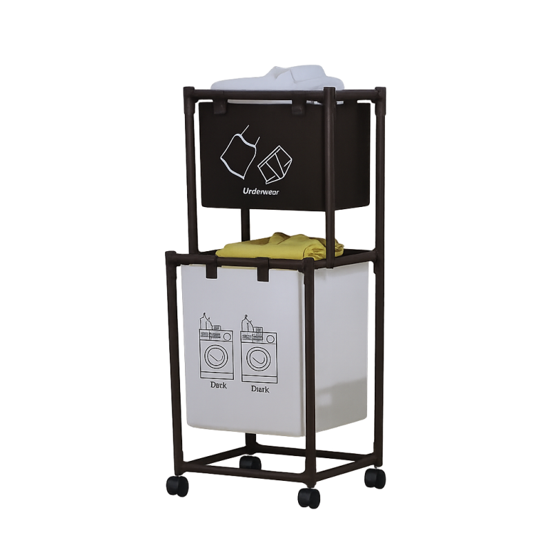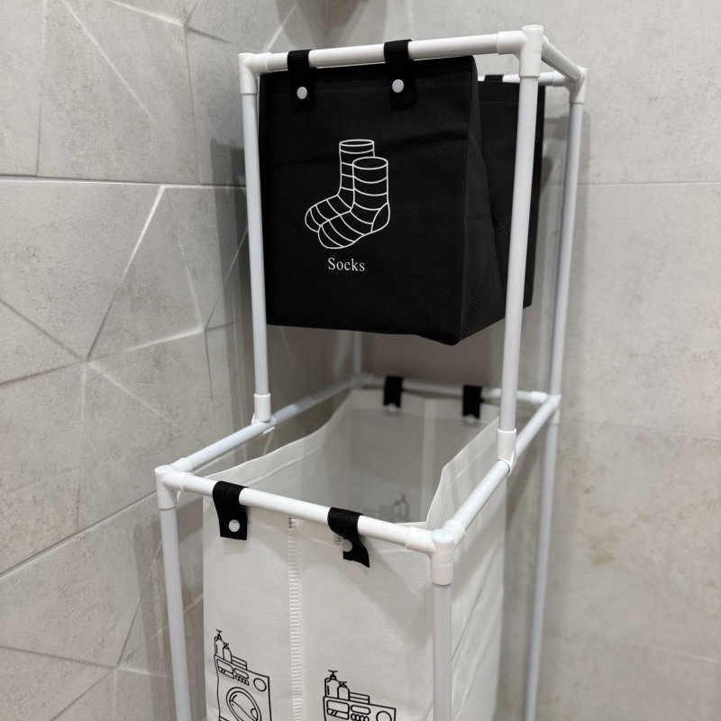 Практичен и удобен кош за пране с 2 отделения – едно голямо за дрехи и отделно за чорапи. Подходящ за всяко домакинство, улеснява разделянето и съхранението на прането.