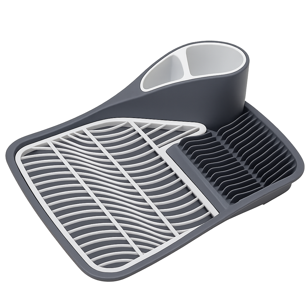Практичен и стилен сушилник за съдове с две зони за чинии и чаши, плюс отделение за прибори.